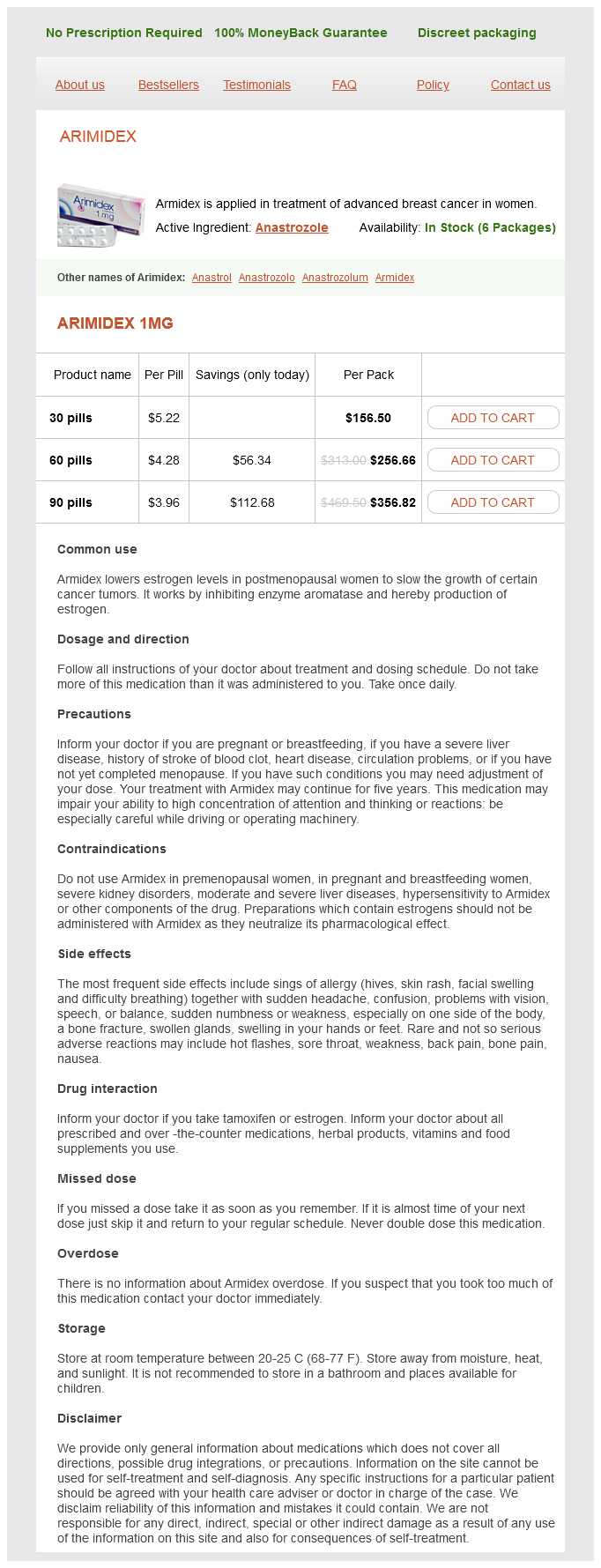 Anastrozole packs: 30 pills, 60 pills, 90 pills