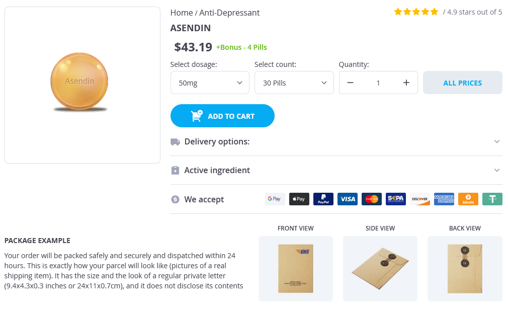 Asendin packs: 30 pills, 60 pills, 90 pills, 120 pills, 180 pills, 360 pills