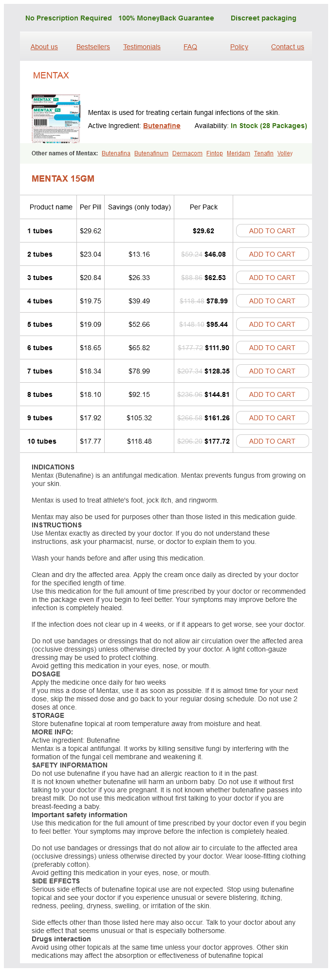 The earliest symptom is usually intermittent tingling of the fingers of one hand antifungal cream for ringworm purchase 15 mg mentax mastercard, often waking the patient from sleep. This tingling may spare the little finger, and is often most prominent in the ring and middle fingers. If the tingling is severe, it is likely to be accompanied by pain in the palm of the hand, sometimes at the elbow or even in the shoulder. As the condition progresses, the patient may find that in the morning the fingers feel swollen and numb. Later, symptoms may occur during the day, and may be brought on by use of the hands. These consist of weakness and wasting of the abductor pollicis brevis and sensory impairment within the distribution of the median nerve in the hand, both of which may be quite mild in degree. The ulnar nerve is frequently injured by penetrating wounds of the forearm and is particularly liable to compression where it lies behind the medial epicondyle of the humerus. This occurs particularly if the groove in which it lies is shallow, in which case it is subject to recurrent injury, such as in individuals whose occupation entails resting the elbows on a hard table. Cubitus valgus whether congenital or as a result of a fracture in the region of the elbow predisposes to this traumatic neuritis. Pain is rare, but paraesthesiae and wasting of the interossei, the hypothenar muscles and the medial two lumbricals cause discomfort and disability. Sensory loss in an ulnar distribution and palpable thickening of the nerve at the elbow afford confirmatory evidence on the nature of the condition. An occupational palsy of the muscles supplied by the deep branch of the ulnar nerve is seen in long-distance cyclists, who lean heavily on the handle-bars, and also in individuals using files, with the instrument held in one hand, and downward pressure exerted by the hypothenar eminence of the other on the end of the file. Weakness and wasting are confined to the interossei, and there is no sensory loss. Therefore, any condition that causes abnormal pigmentation in the skin can produce similar changes in the oral cavity, although the effects are usually not as marked. As in the skin, they represent a collection of the normal melanocytes, but instead of being evenly distributed in the basal layer, the cells are aggregated together. Depending on their position in relation to the basement membrane, they give rise to junctional naevi, compound naevi, intramucosal naevi and blue naevi. The lesions are twice as common in females as in males and tend to occur in middle-age. It is mostly found in the upper jaw, especially the palate, followed by the gingival mucosa. It is more common in Japanese, Indian and African races, and one-third of cases are preceded by a history of oral pigmentation. As in the skin, any oral pigmented lesion that increases in size, changes its surface characteristics or colour and starts to bleed should be suspected as being a malignant melanoma. Growth of the lesion is followed by destruction of the underlying bone and loosening of the teeth, with rapid spread to the regional lymph nodes. If malignant change is suspected, a wide excision of the lesion should be carried out. Rarely, the mouth may be involved, with secondary deposits from a cutaneous melanoma. The tumour grows rapidly in size, with underlying bone destruction and displacement of the developing teeth. The correct diagnosis is essential as the tumour is benign and responds well to simple enucleation. There are multiple freckles on the face, especially around the mouth (circumoral pigmentation), the eyes and the nose. The polyps in the intestine rarely become malignant, as they are hamartomas in origin. The skin becomes pigmented early on in the disease, especially the exposed areas, while the oral cavity shows patchy melanotic pigmentation, which varies in colour from light brown to black. If this disease is suspected, the diagnosis will be verified by measuring the blood pressure (which is low), the blood urea (which is raised) and the serum sodium (which is lowered). However, 5 per cent of Caucasian people also show pigmentation of the oral mucosa. The recognition of oral lesions is important, as there is a strong association with concurrent pulmonary or gastrointestinal disease, which frequently requires treatment with chemotherapy.