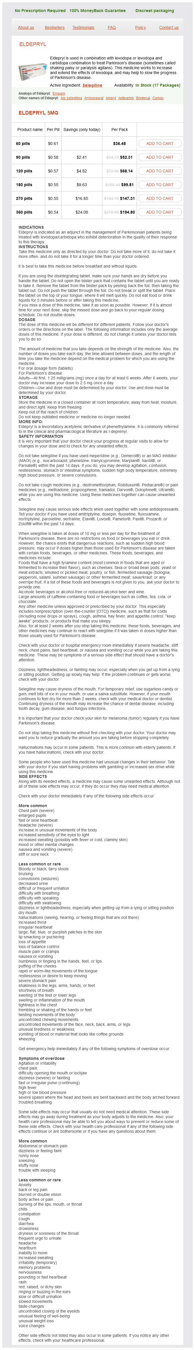 Selegiline packs: 60 pills, 90 pills, 120 pills, 180 pills, 270 pills, 360 pills